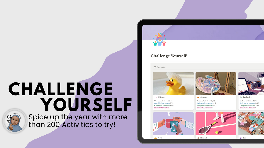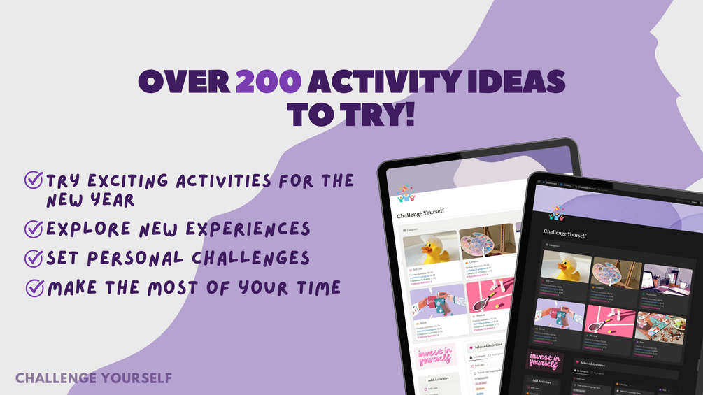 Discover over 200 activity ideas designed to inspire and enrich every aspect of your life! Whether you're looking to embrace creativity, prioritize self-love, have fun, be productive, connect socially, or stay physically active, this Notion template has something for everyone.