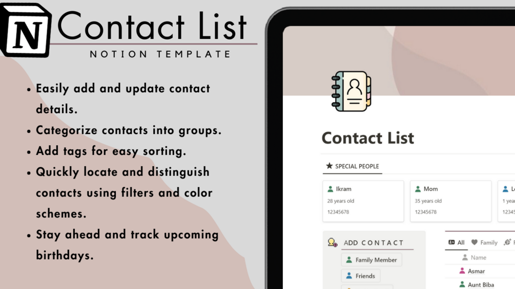 Effortlessly organize and store your contacts with our Contact List Notion Template.