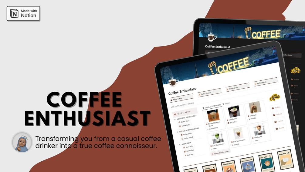 Introducing the Ultimate Coffee Enthusiast Notion Template designed to support your journey every step of the way, this template transforms you from a casual coffee drinker into a true coffee connoisseur. Whether you’re a home barista, a coffee professional, or simply someone who loves a great cup of joe, this template has everything you need.