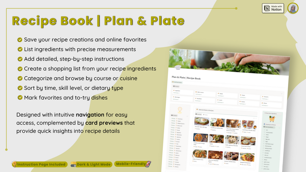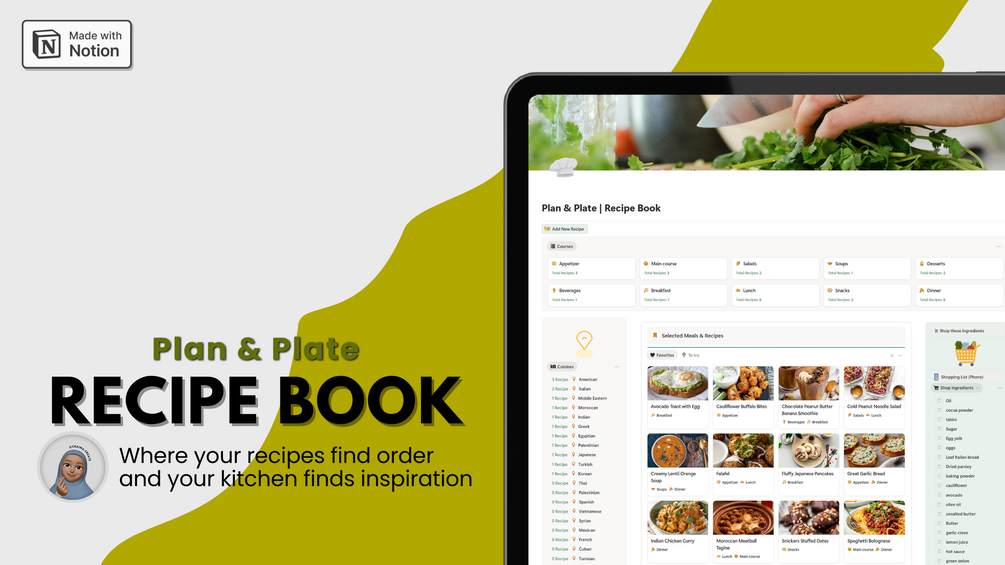 Elevate your culinary creativity with the Plan & Plate Recipe Book, a sleek and dynamic Notion template made for passionate home cooks and food enthusiasts. Whether you want to collect recipes from different sources or jot down your own creations, this digital recipe book simplifies your cooking routine and turns your collection into a beautifully organized, inspiring, and functional cooking companion.